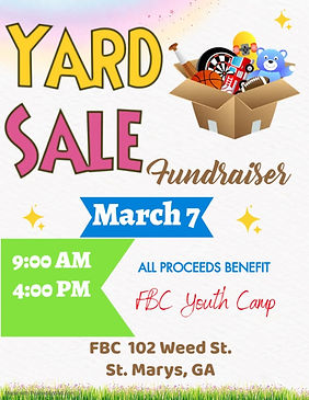 The youth of FBC St Marys are having a yard sale to raise funds for their youth camp this summer. Located at 102 West Weed Street in St. Marys. This event will begin on March 7 at 9:00am and end at 4:00pmThey have a large assortment of clothing, appliances, electronics, furniture and housewares. All proceeds benefit First Baptist Youth Camp. For more information call Gary at 706-581-4427 or email at gary@fbcstmarys.com
